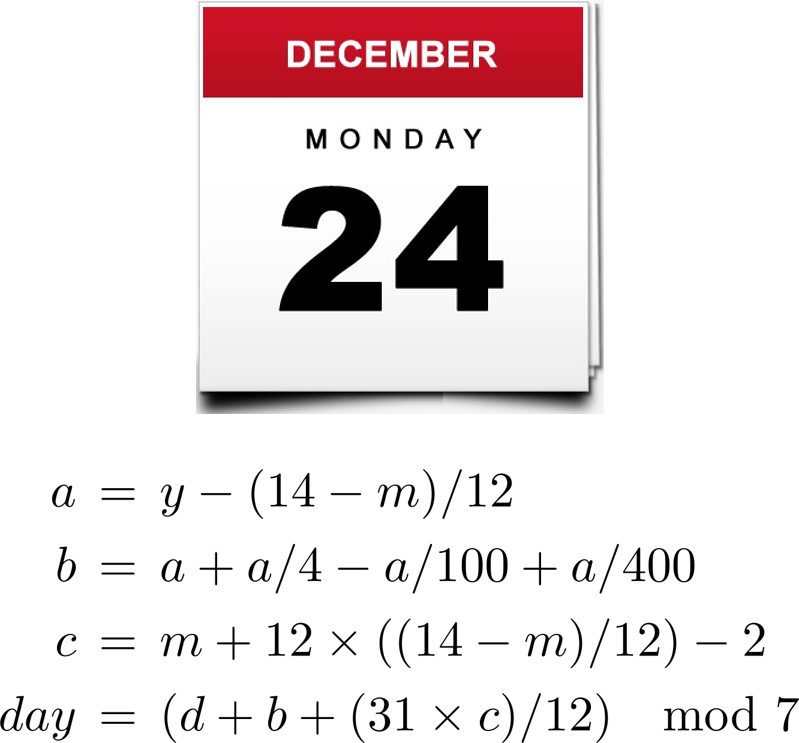 Your program should take three integers: y (year), m (month), and d (date). For m use 1 for January, 2 for February, and so on. For output print 0 for Sunday, 1 for Monday, 2 for Tuesday, and so on.
